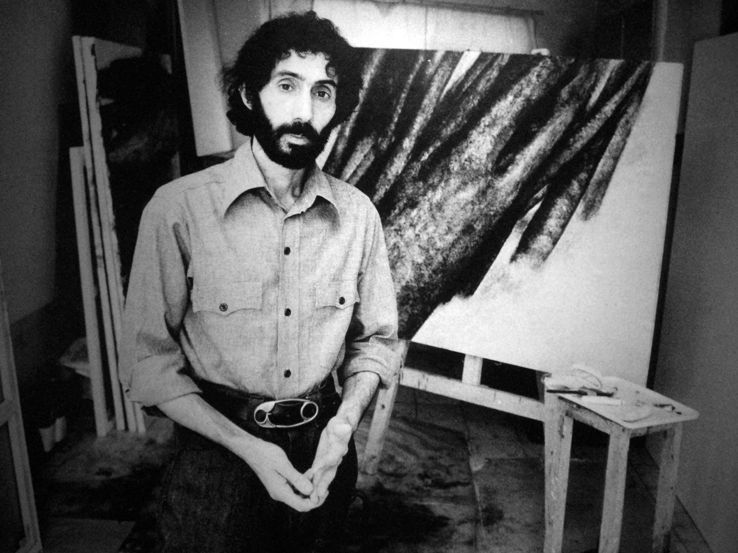 سهراب سپهری در کارگاه نقاشی در کنار اثری از مجموعهی «درختان»