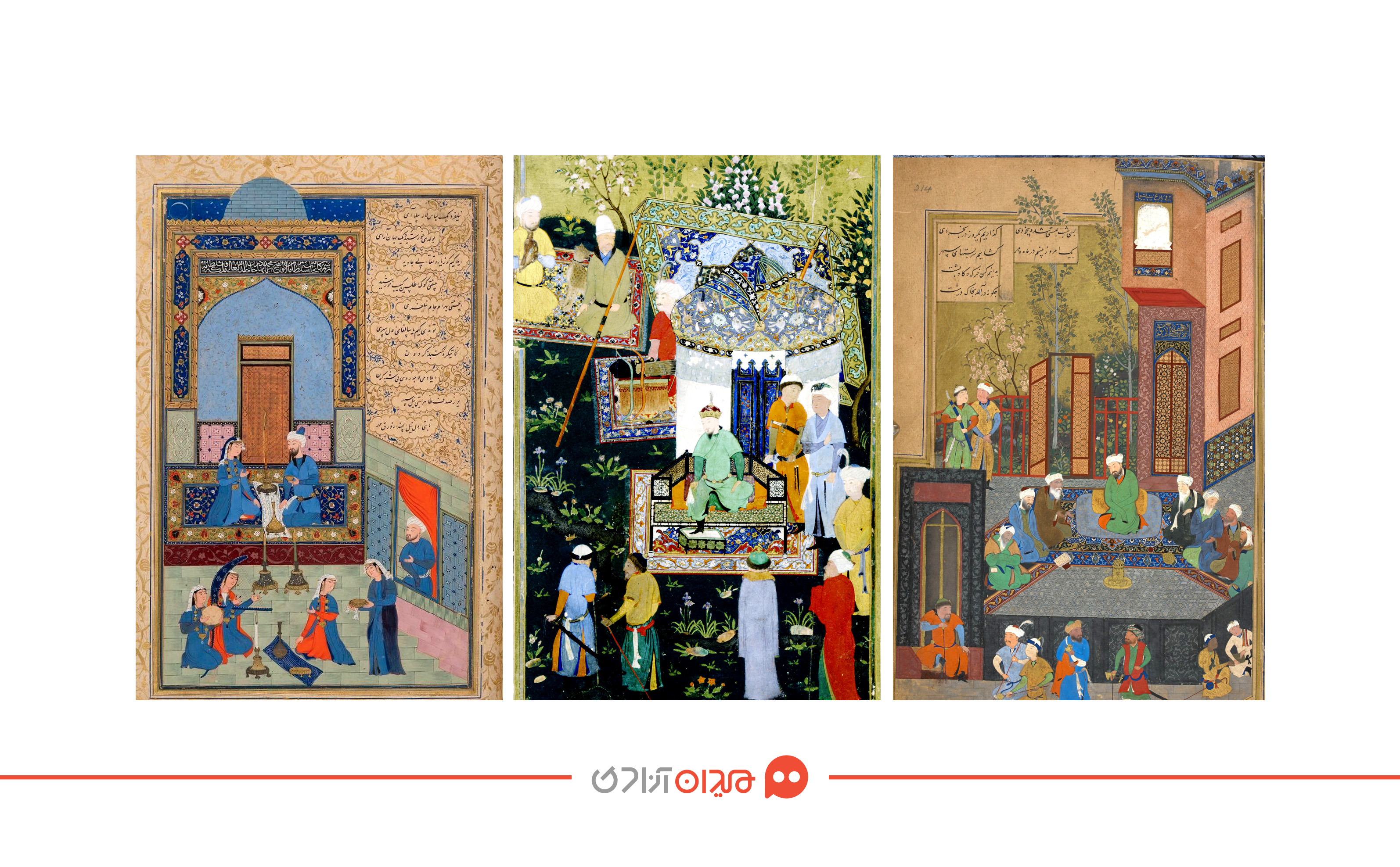 از راست به چپ: « خلوت ساختن اسکندر با هفت حکیم» اثر کمالالدین بهزاد، «تیمور در تفرجگاه» اثر کمالالدین بهزاد و «گنبد فیروزه» اثر کمالالدین بهزاد