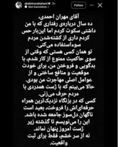 کاهانی در صفحۀ اینستاگرامش نوشت: « ...تو با بدگویی و فروختن من، برای خودت موقعیت و منافع ساختی و از عوامل اصلی مهاجرت من بودی. حالا می‌بینم که با ژست همدردی با مردم حرف می‌زنی. کسی که در بزنگاه نزدیک‌ترین همراه حرفه‌ای‌اش را فروخت، بعید است ناگهان دلسوز جامعه شده باشد... »