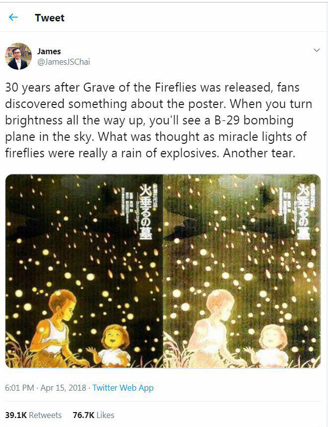 و اما نکتهی جالبی که در این یادداشت میخواهم بگویم و تا پیش از این در منابع فارسیزبان ندیدهام موضوع جدید پوستر این انیمیشن است: ششسال پیش، سیسال پس از ساخت «مدفن کرمهای شبتاب» و در سال درگذشت کارگردانش، در توئیتها و رسانهها خبری پیچید: دو پوستر اصلی فیلم در زمان اکران، شامل تصویر دو شخصیت اصلی انیمشن در پایین صفحه و در بالای صفحه نیز آسمان شب و ستارگان یا کرمهای شبتاب هستند. حال پس از سیسال با زیادکردن نورصفحه مشخصشده کارگردان فیلم رندانه یا دردمندانه، در آن بخش سیاه بالای پوستر، تصویر هواپیمای آمریکایی را هم قرارداده، اما آن بخش را آنقدر تیره و تاریک کرده تا هواپیما پنهانشود. همچنین با پرنور شدن صفحه و مشخصشدن هواپیما، کرمهای شبتاب حالتی استعاری پیدا میکنند و میتوانند در نظر بیننده به عنوان شعلههای بمب آتشزا تفسیر شوند. تاکاهاتا با این کار، پیامی را برای نسلهای آینده کشور و اثرش فرستاده که حتی اگر هواپیما به صورت واضح هم در پوستر میآمد مخابره نمیشد: پیام رنج، نفرت و مظلومیت؛ در عین ترس، خفقان و اسارت.