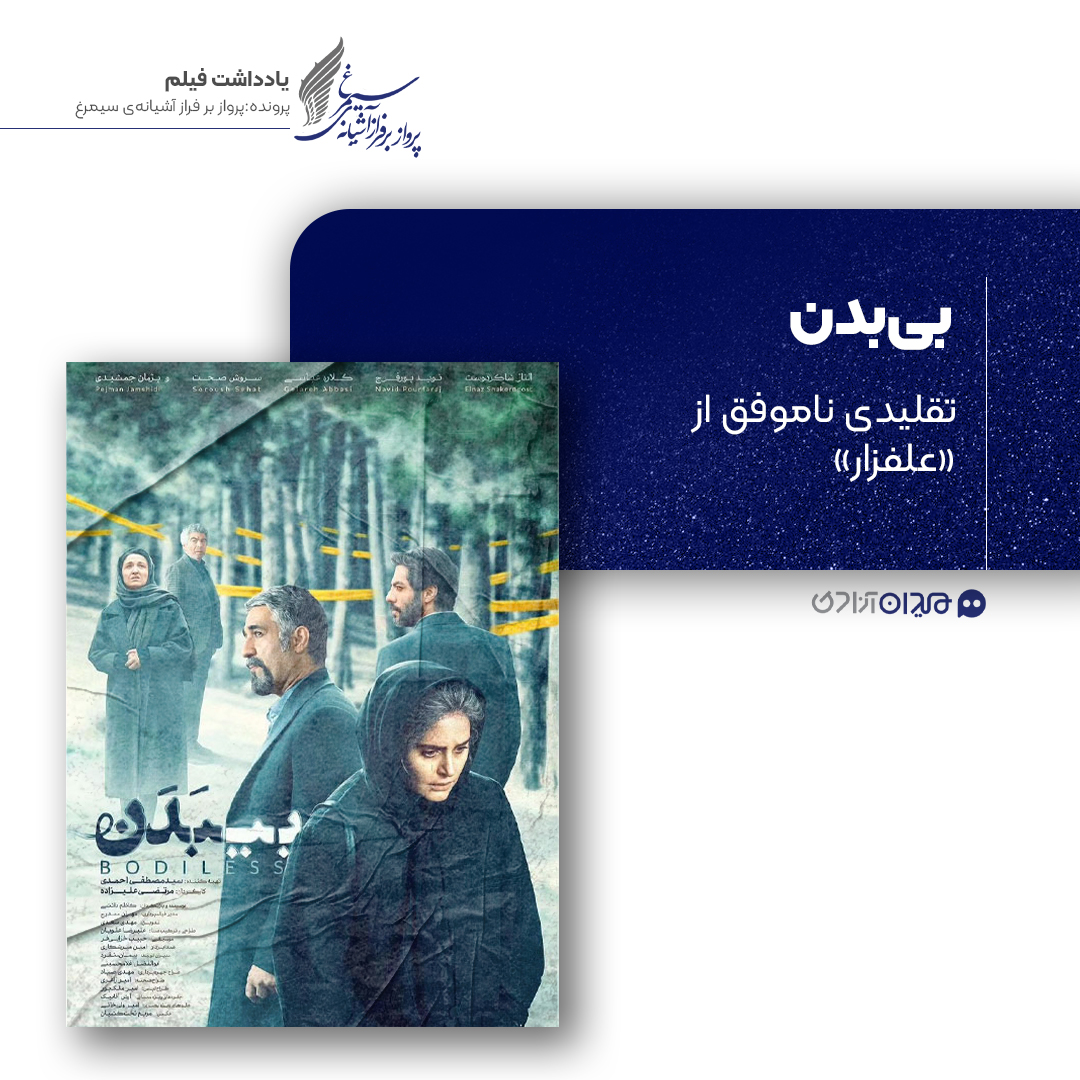 بدن و روح در فیلم «بیبدن» چه جایگاهی دارد؟ شواهد و مصادیق بسیاری در فیلم وجود دارد که گویای تشابه و برداشت فیلم از داستان واقعی غزاله شکور و آرمان عبدالعالی است اما نویسنده فیلمنامه ادعا دارد که اثرش، برگرفته از پروندههای زیاد مشابه آن است و من هم در اینجا قصد آن ندارم که بحث کنم آیا واقعاً این فیلم بر اساس آن واقعه بوده یا خیر. در دقایق اول فیلم، مخصوصاً با دیدن افعال و حالات محسن شکوهی (بازپرس پرونده، با بازی نوید پورفرج)، بلافاصله به یاد فیلم علفزار افتادم و این یادآوری و حس در چندین جای فیلم تکرار شد. پس از بیرون آمدن از سینما، جستجو کردم و متوجه شدم نویسنده هر دو فیلم جناب کاظم دانشی عزیز است؛ البته علفزار به لحاظ فیلمنامه مستحکمتر بود و علاوه بر سیمرغهای بهترین تدوین، بهترین صداگذاری و بهترین نقش مکمل زن، سیمرغ بهترین فیلمنامه را هم از جشنواره چهلم فجر نصیب خود کرد. ظاهراً مرتضی علیزاده و سید مصطفی احمدی (کارگردان و تهیهکننده فیلم «بیبدن») میخواستند موفقیت علفزار تکرار شود اما حواسشان نبود که در علفزار (با همین فضای بازپرسی و قتل و تجاوز و ...)، این وجود خرده داستانهای دیگرِ موجود در فیلم بود که هم به اصل فیلم کمک کرد و هم از فشار روانیای که فیلم بر مخاطبش وارد میآورد، میکاست.