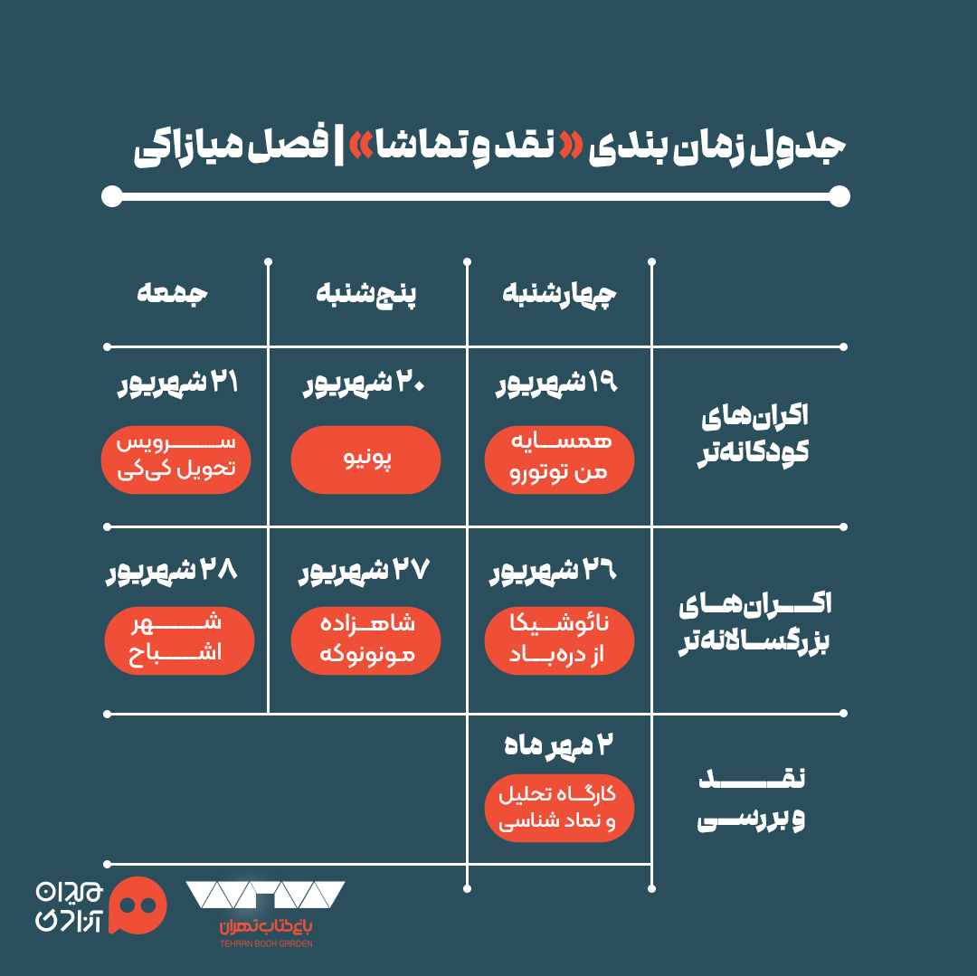 از روز 19 شهریور، فصل اول رویداد سینمایی «نقد و تماشا»ی مجله میدان آزادی با اکران و بررسی بهترین انیمیشنهای هایائو میازاکی -بزرگترین کارگردان انیمیشنِ امروزِ دنیا- در باغ کتاب تهران در حال برگزاری است. در این رویداد که در سه هفته متوالی برگزار میشود، انیمیشنها در سانس ساعت ۲۱ آمفیتئاتر بزرگ و روباز باغ کتاب تهران اکران خواهد شد. این رویداد هنری در هفتۀ گذشته میزبان برترین انیمیشنهای کودکانۀ میازاکی («توتورو»، «پونیو» و «کیکی») بود و در این هفته هم میزبان سه شاهکار انیمیشن دیگر میازاکی متناسب با مخاطب نوجوان و بزرگسال است. همچنین طبق اعلام مجله میدان آزادی پس از پایان دو هفته اکران، نشست نقد و بررسی در پنجشنبه سوم مهرماه در سالن ۸ باغ کتاب برگزار خواهد شد.