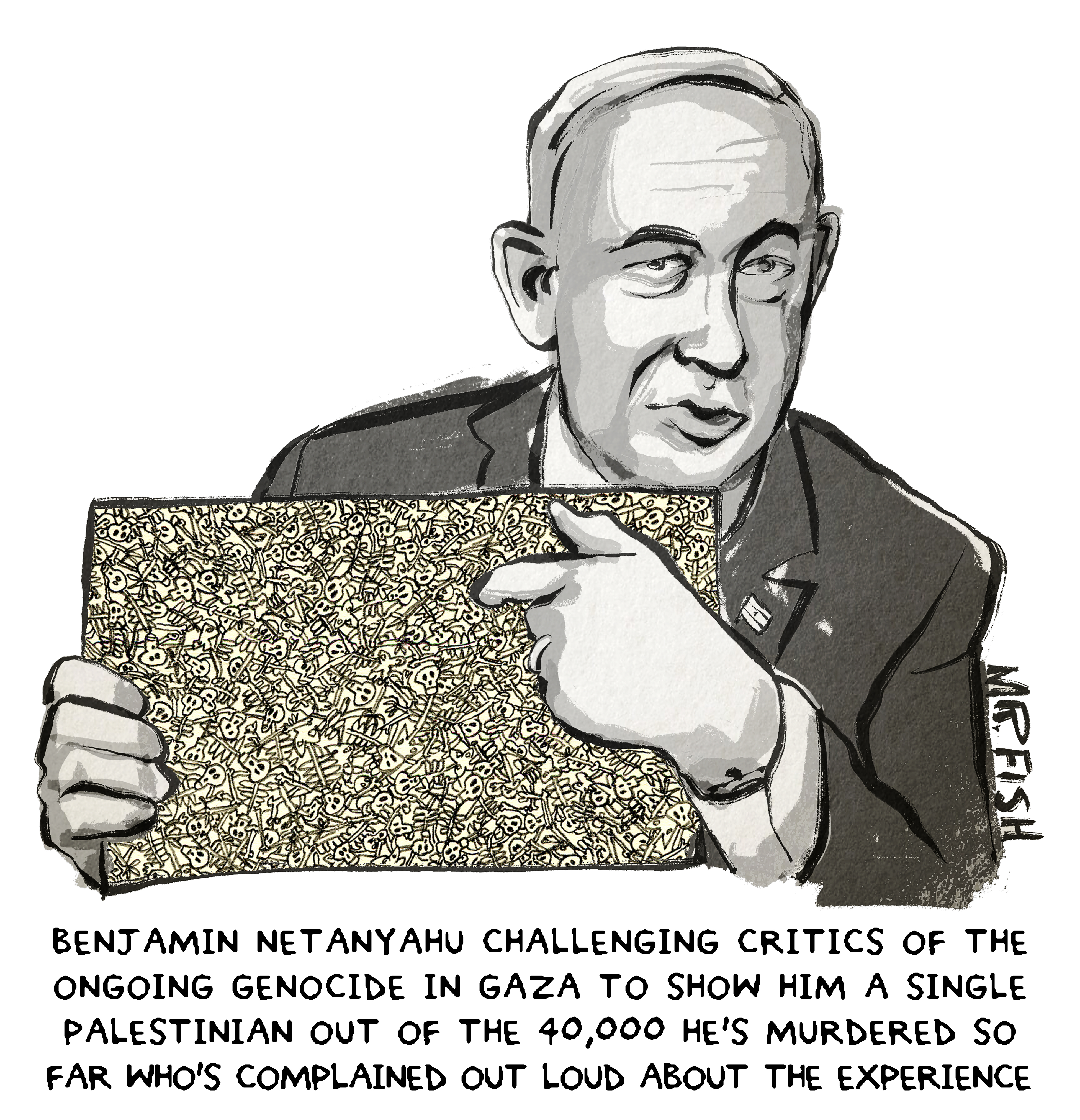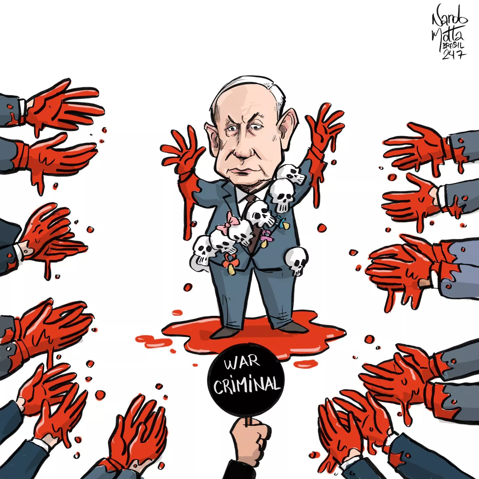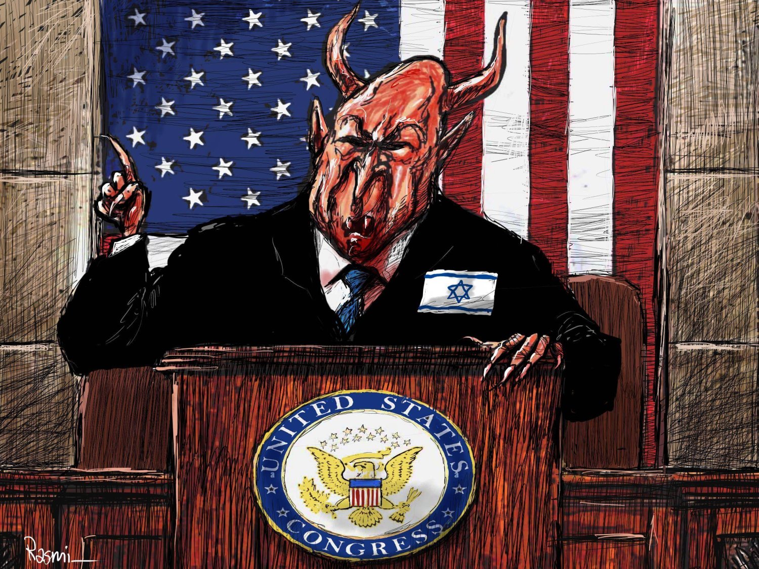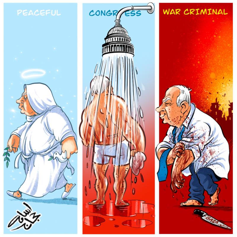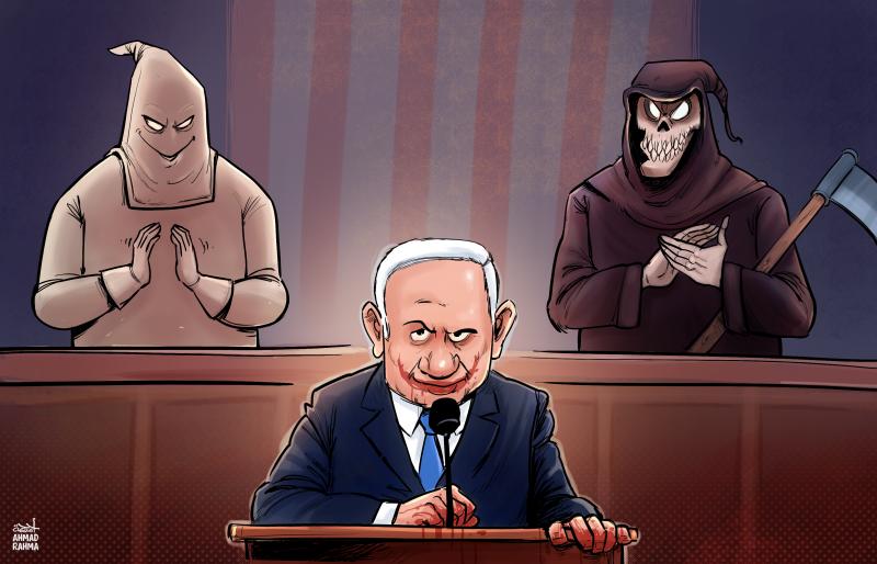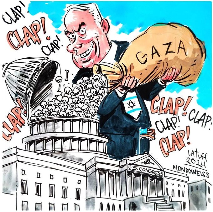 مجله میدان آزادی: 28 جولای 2024 زمانی که غزه زیر بمبارانهای بیامان صهیونیستها دست و پا میزد، بنیامین نتانیاهو وارد کنگره امریکا در واشنگتن شد و ضمن ایراد سخنانی علیه ایران خواستار حمایتهای بیشتر مالی، نظامی و لجستیکی از جانب دولت آمریکا برای فشارهای پیاپی رژیم خود علیه غزه شد، او طی این سخنرانی برنامهی سرکوبگرایانهی خود را مطرح کرد و مورد تشویق حاضران کنگره نمایندگان آمریکا قرار گرفت.این رویداد واکنش خشمگینانهی هنرمندان آزاده و صلحطلب سراسر جهان را برانگیخت و باعث شد آثار گرافیکی و بصری بسیاری با موضوع هجو نتانیاهو و کنگرهی آمریکا خلق و منتشر شود.