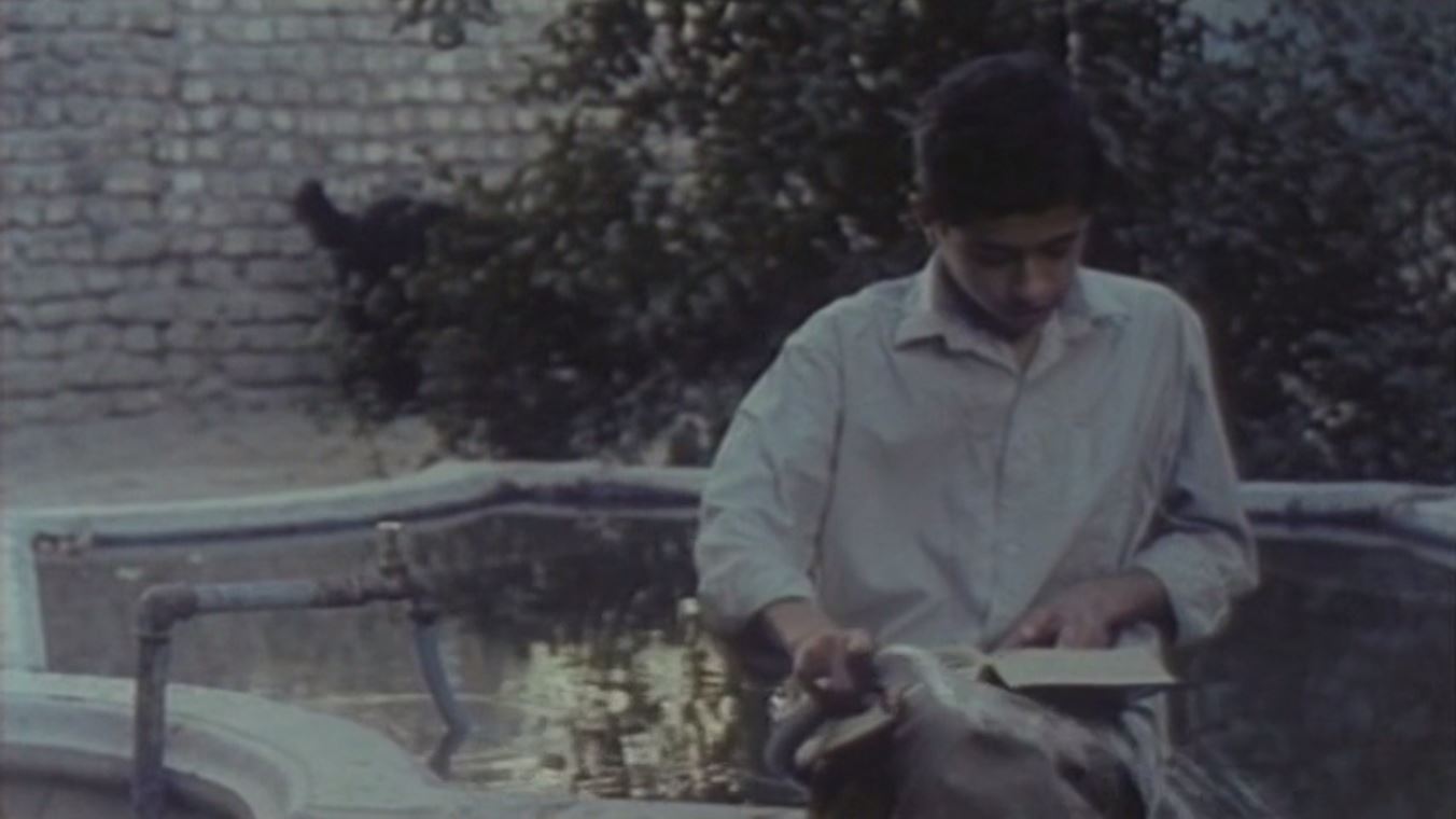مجید درحال کتاب خواندن و آب دادن به باغچه، برگرفته از اقتباس سینمایی «نان وشعر» ساختهی «کیومرث پوراحمد»
