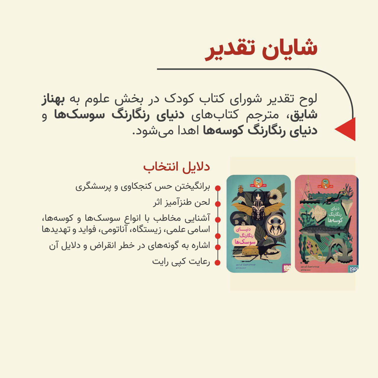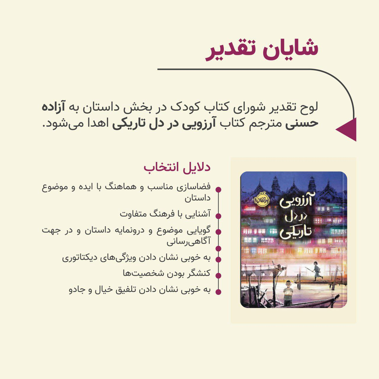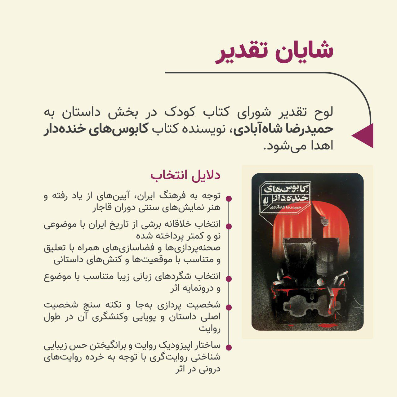 به گزارش مجله میدان آزادی، شورای کتاب کودک هر ساله پس از بررسی کتابهای کودک و نوجوان آثاری را به عنوان برگزیده و شایستهی تقدیر معرفی میکند.