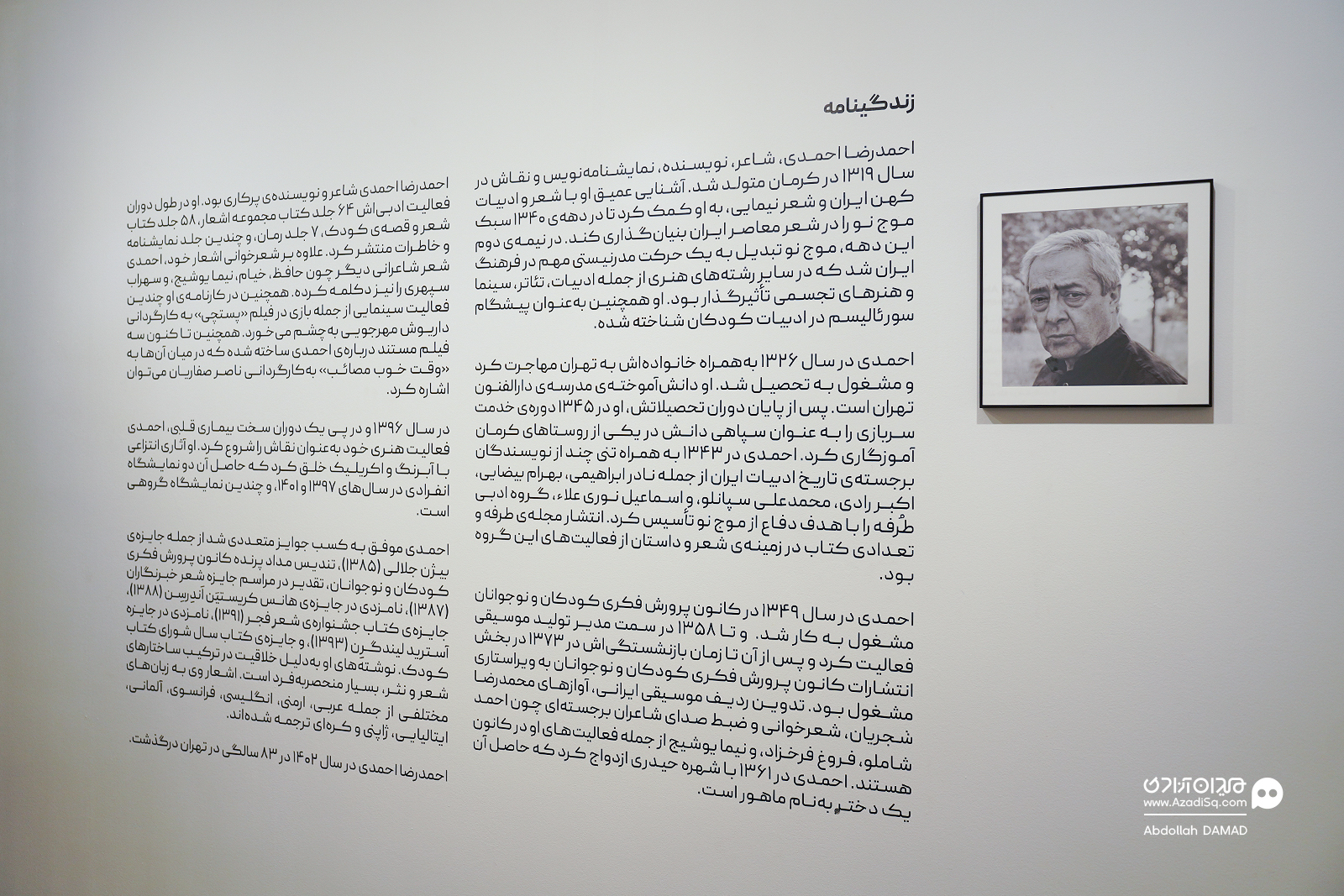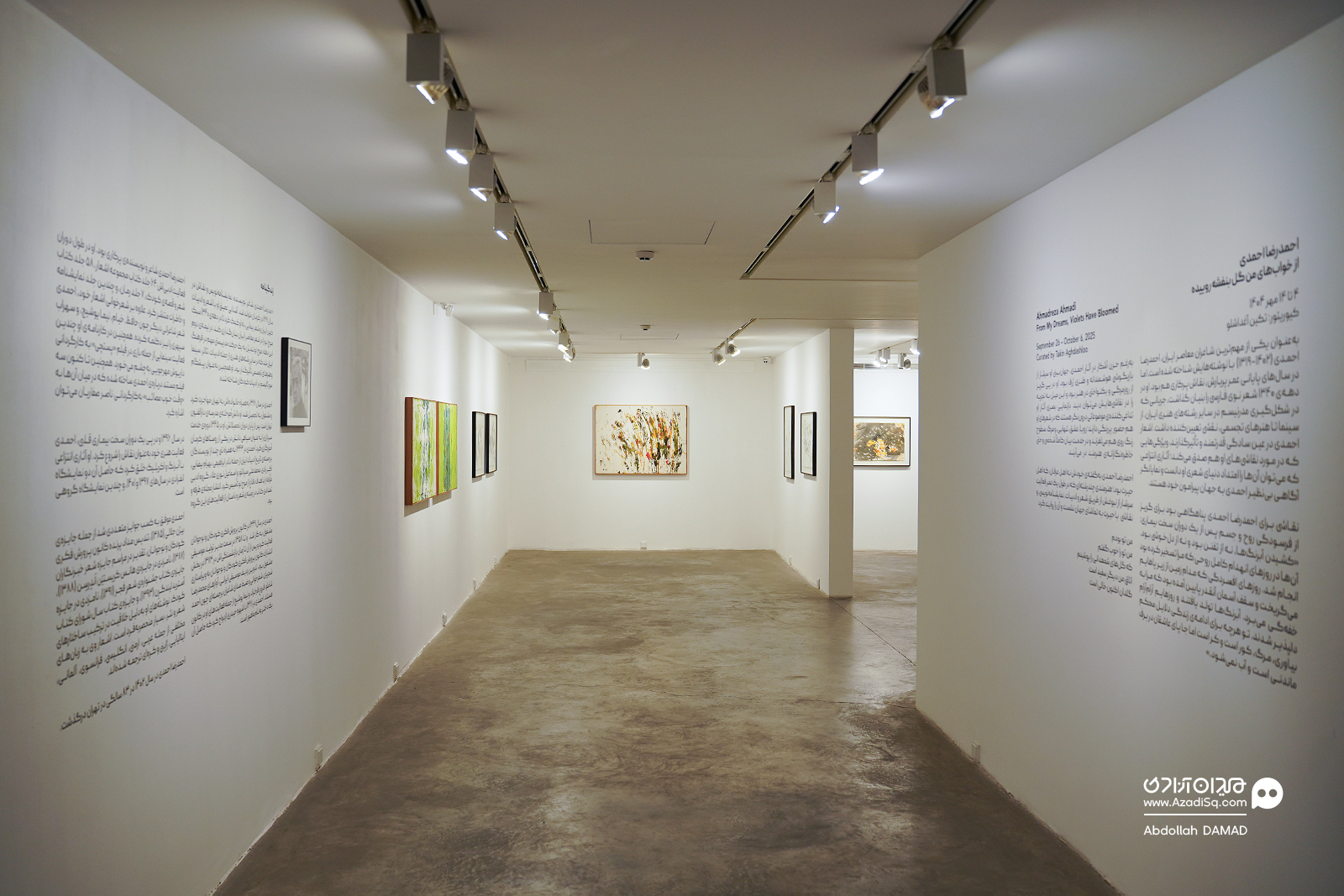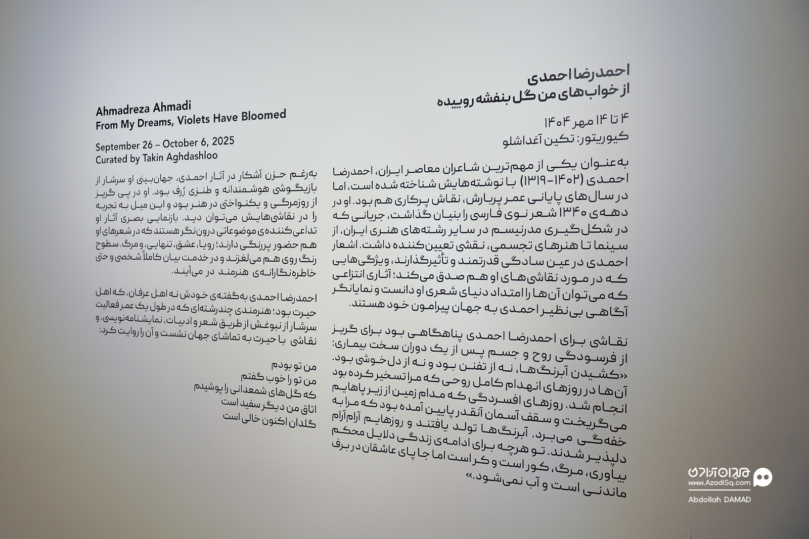 مجله میدان آزادی: «احمدرضا احمدی» شاعر، نویسنده و مدیر هنری سرشناسی است که خیلی‌ها او را به خاطر داستان‌هایی که برای کودکان نوشته یا شعرهای سپیدی که سروده می‌شناسند و دوست دارند. اما او در سال‌های پایانی مدتی مشغول نقاشی هم شد. «از خواب‌های من گل بنفشه روییده» نمایشگاهی از همین نقاشی‌های دوران کهنسالی او بود که از ۴ تا ۱۴ مهر ۱۴۰۴ با نمایشگاه‌گردانی «تکین آغداشلو» در «گالری باوان» تهران به نمایش درآمدند. در بخشی از استیتمنت (یا بیانیۀ) این نمایشگاه آمده: