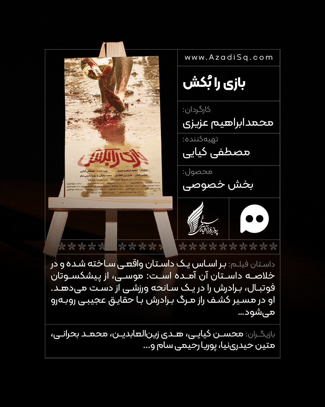 فیلم «بازی را بکش» در ژانر اجتماعی که محصول سال ۱۴۰۲ است، به جشنوارهی فجر ۱۴۰۳ راه پیدا کرده و اولین فیلم بلند محمدابراهیم عزیزی است. در کارنامهی هنری این کارگردان، فیلمهای کوتاهی چون «سفر تابستانی طوبی»، «حقایقی در رابطه با سگها و گربهها» و «هجوم ابر تیره» وجود دارد. اما بارزترین اثر او در واقع فیلم کوتاه «دوست برادر همسایه» است که با محوریت روابط انسانی و اجتماعی ساخته شده و نشاندهندهی دغدغهمند بودن کارگردان نسبت به این مسائل است. فیلم «بازی را بکش» نیز از این طرز فکر تبعیت میکند و فیلمی در رابطه با یک معضل اجتماعی است. اگرچه یکی از تفاوتهای اصلی این فیلم با سایر آثار کارگردان در این است که داستان این فیلم جنجالیِ فوتبالی، از یک داستان واقعی گرفته شده.