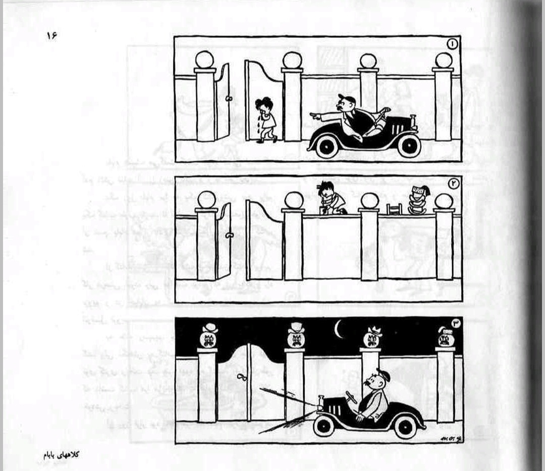 نمیدانم در نسخههای چاپ جدید هم همچنان آن توصیهنامهی بلندبالا وجود دارد یا نه اما یکی از تفاوتهای چاپهای جدید، که به نظرم چندان هم جالب نیست، رنگی شدن آن است که امکان رنگ کردن تصاویر را از بچهها گرفته است. این کتاب برای من و نسل من، علاوه بر کتابی که ما را در رویای باسواد شدن همراهی میکرد، یک کتاب رنگآمیزی هم بود و چون بخشی از داستان، دنبالهدار میشد، نیاز داشت که ضمن رنگآمیزی به حوادث داستان هم توجه کنیم. مثلاً برادرم بارها برایم توضیح داد که در همهی قسمتهایی که پدر و پسر در جزیره گیر کردهاند، باید لباسشان را یک رنگ بزنم، چون آنها توی آن جزیره نمیتوانند لباسهای جدید بپوشند.