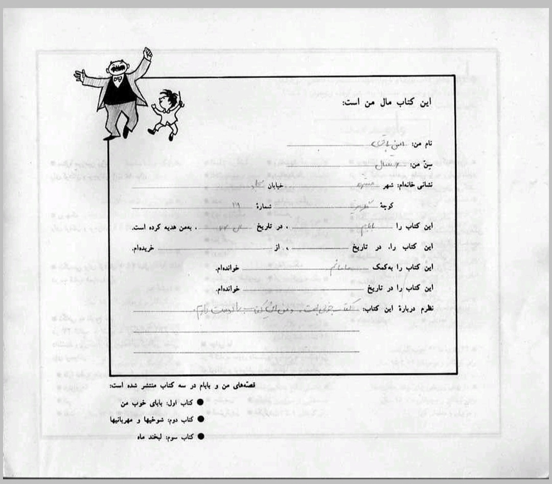 «این کتاب را ..........، در تاریخ .......... به من هدیه کردهاست. این کتاب را به کمک ........... خواندهام.» در آخرین صفحهی کتاب «من و بابام» همین جملات نوشته شده است. نسخهای که من در کودکی داشتم، متعلق به خواهر و برادرم بود و احتمالاً پدرم برایشان خریده و من بارها و بارها خواندمش آنقدر که برای جلوگیری از خراب شدن کتاب، آن را جلد کردیم. قبل از اینکه خواندن یاد بگیرم تصاویرش را نگاه کردم و وقتی باسواد شدم، داستانهایش را خواندم و در تمام این مدت مشغول رنگ کردنش بودم.