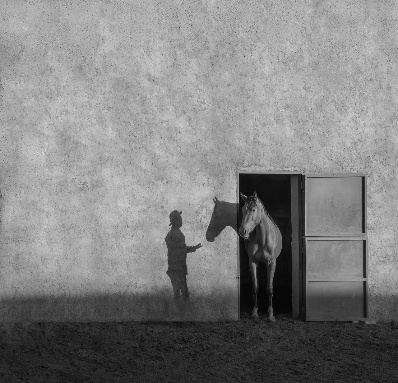 در این اثر، اسب از اصطبل خارج شده است، در نگاه اول، تصویر بسیار ساده به نظر میرسد، اما با دقت بیشتر، حضور سایهی انسان بر روی دیوار، بعدی جدید به آن اضافه میکند. اسب در انتظار مهتر خود، بیحوصله میشود و در خیال خود، تصویر مهتر را بر روی دیوار میبیند. از نظر هنرمند لحظات کشندهی انتظار، موضوع اصلی این تصویر است که روح و روان اسب، این حیوان زیبا و نجیب را مچاله کرده است بهطوریکه مهتر خود را در خیال، تجسم میکند.