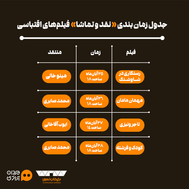 در فصل جدید رویداد نقد و تماشا، به مدت 4 شب از یکشنبه 25 آبانماه تا چهارشنبه 28 آبانماه 1404 به سراغ اکران فیلمهای سینمای اقتباسی خواهیم رفت.