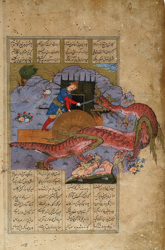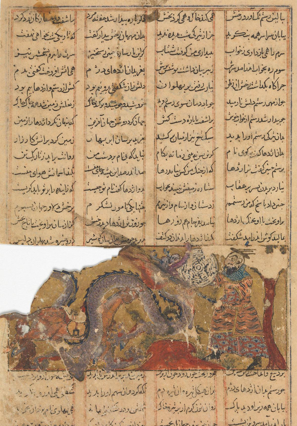 مینیاتور «گشتاسپ اژدها را میکشد»، جوهر، آبرنگ مات و طلا روی کاغذ، محل نگهداری: موزه هنرهای هاروارد