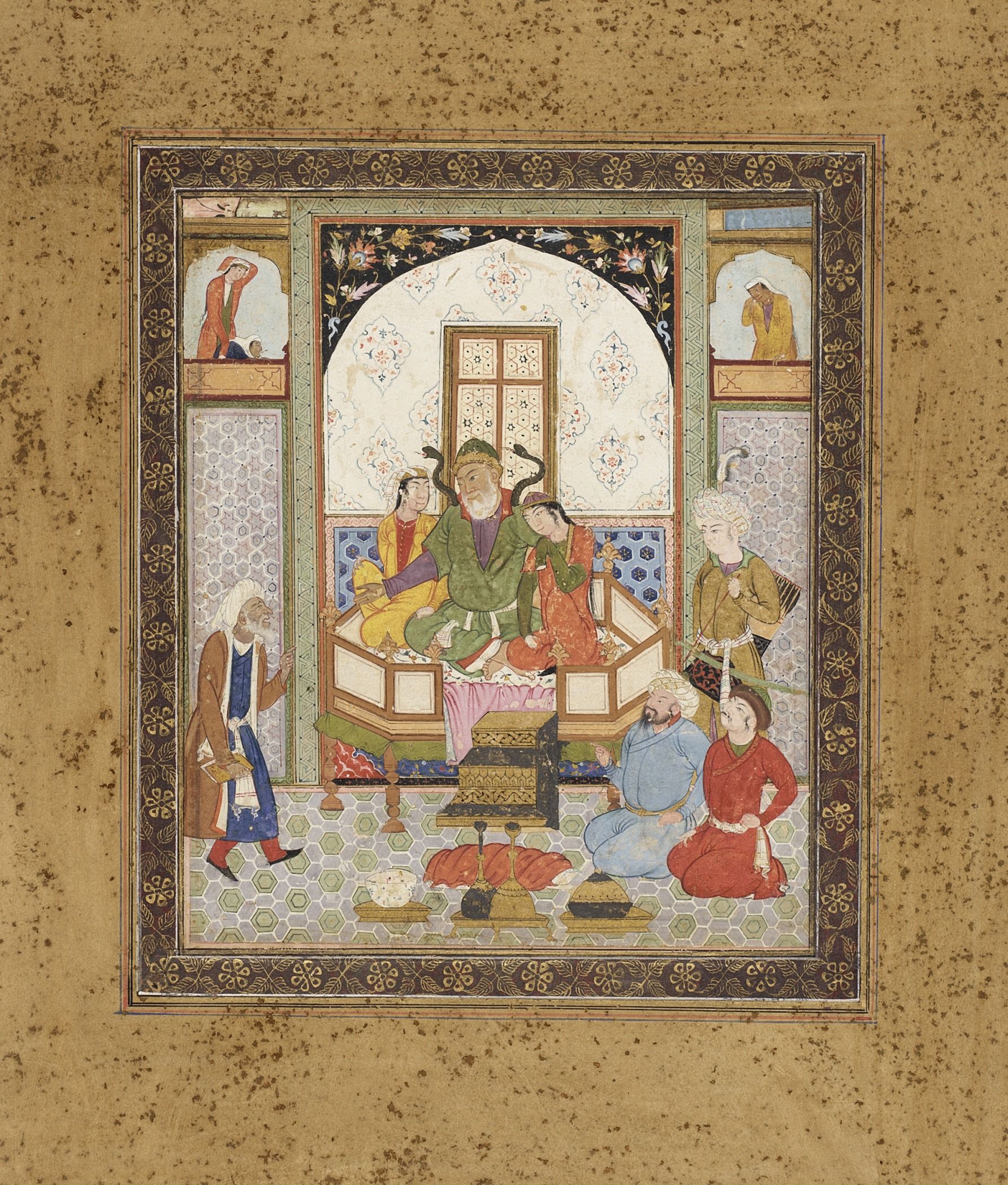 مینیاتور «ضحاک در کنار دختران جمشید نشسته بر تخت سلطنت»، جوهر، آبرنگ مات و طلا روی کاغذ