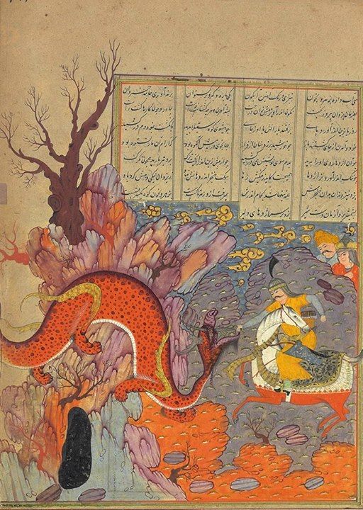 مینیاتور «خوان سوم؛ نبرد رستم با اژدها و کشتن آن»، جوهر، آبرنگ مات، و طلا روی کاغذ، محل نگهداری: موزه متروپولیتن نیویورک