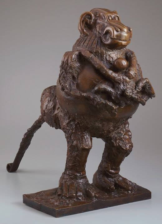 در مجسمهی بابون و بچهاش، یک ماشین اسباببازی تبدیل به سر میمون شده که دو گوی کوچک نقش چشمهای وحشی او را دارند و یک فنر آهنی، ستون فقرات و دم او را تشکیل داده است. این اثر یک بابون ماده ایستاده که بچهاش را در آغوش گرفته نشان میدهد. این مجسمه که سال 1951 ساخته شده، نمادی از استفادهی اشیاء پیدا شده و در نهایت ریختهگری با برنز است.
