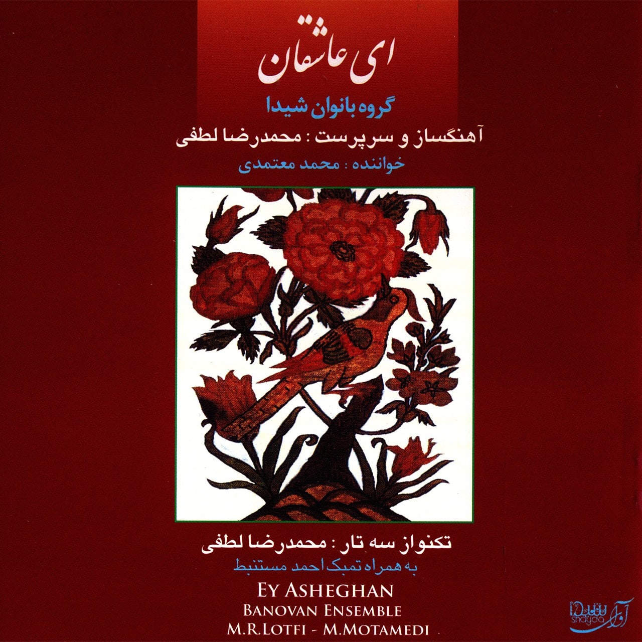 لطفی به جز کنسرتها، در چهار آلبوم از آواز معتمدی استفاده کرده است که پس از وطنم ایران، ای عاشقان موفقترینِ این همکاریهاست. سه شاهکار لطفی در این آلبوم یکی پیش درآمد و آواز ضربی ابتدای آلبوم است و دیگر دو تصنیف «گفتم غم تو دارم» و «ای عاشقان». در این آلبوم درونمایههای عرفانی کمتر به چشم میخورد و درونمایههای عاشقانه پررنگتر است، هم در آوازها هم در تصنیف گفتم غم تو دارم که لطفی زمانی آن را هنگام جدایی از همسرش ساخته بوده است. آواز قطعه ابتدایی و نیز تصنیف ای عاشقان را به نحوی میتوان با درونمایه اجتماعی دانست. غزل آواز اول (بود آیا که در میکدهها بگشایند) جزو شعرهای حافظ است که بیشتر حالوهوای اجتماعی دارد و غزل تصنیف آخر (ای عاشقان ای عاشقان پیمانهها پر خون کنید) از غزلهای ابتهاج برای روزهای پیروزی انقلاب است. به جز این تصنیف دو تصنیف دیگر نیز با این غزل توسط دیگران ساخته شده که مشهورترین و اولینش با آهنگسازی کیهان کلهر و خوانندگی محمدرضا شجریان است و دیگری با آهنگسازی پژمان طاهری و خوانندگی شهرام ناظری).