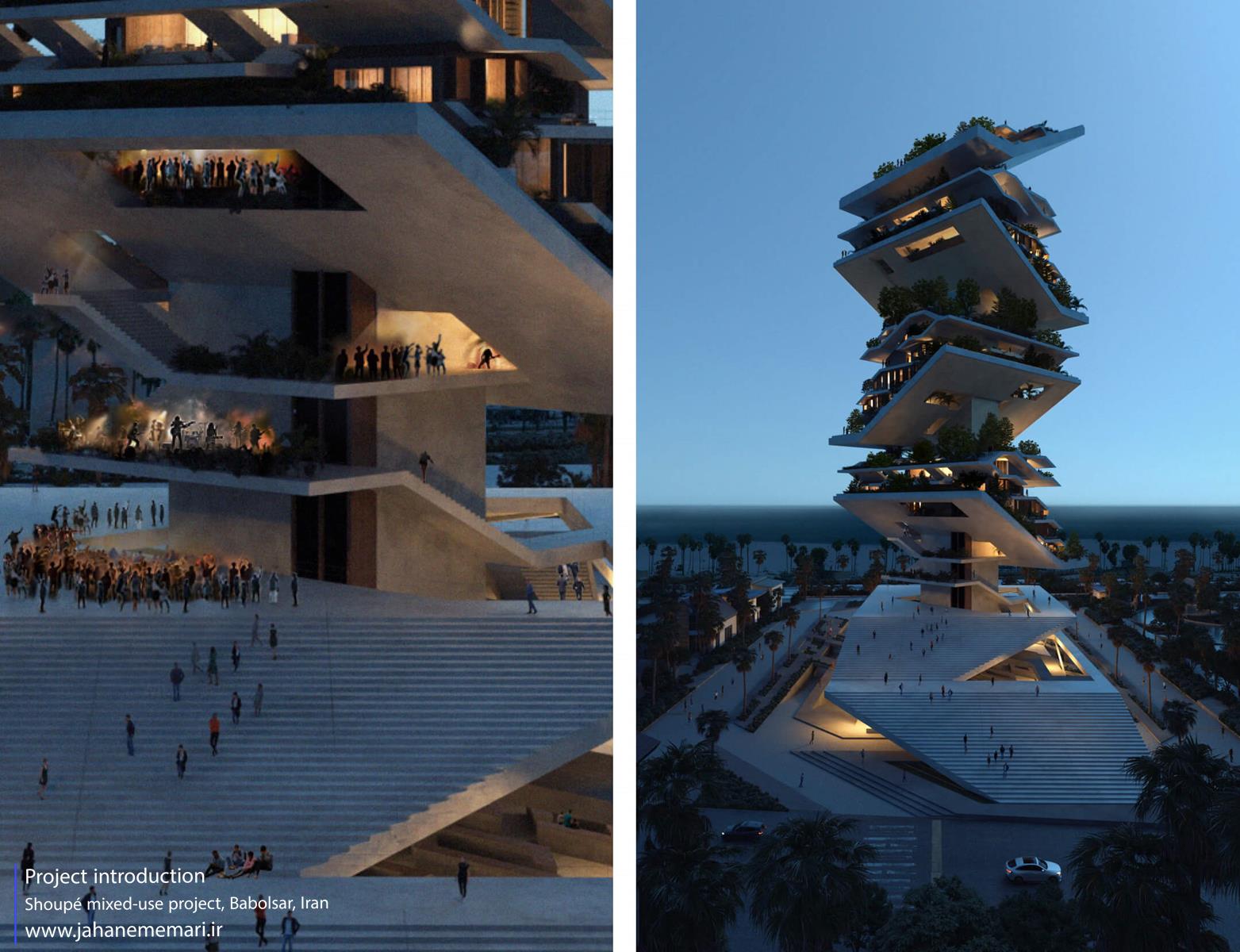 این طرح در بخش «پروژههای آینده» و در زیرگروه ساختمانهایی با «استفادهی چندمنظوره» رتبهی اول این جایزه جهانی را به دست آورد. ویژگی خاص این طرح این است که ساختار سنتی محلهها و روستاهای شمال ایران را در قالب یک برج مدرن مجسم میکند و شما با یک سازهی کاملا مدرن اما با حال و هوای معماری سنتی روستاها و طبیعت مازندران و با تاکید بر سازمان محله، روبهرو میشوید. این برج که با الهام از روستاهای کوهستانی مازندران به صورت بلندمرتبه و در ارتفاع طراحی شده است میدانهای عمومی و بازارهای محلی را نیز در تمام محلههای 18 طبقهی خود جای داده است.