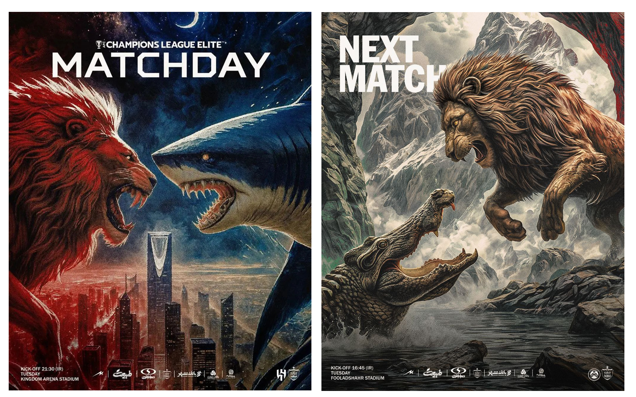 باشگاه پرسپولیس البته مدتی است یک شیر تقریبا سرخ را به عنوان نماد خود برگزیده و سعی دارد با تکرار آن در پوسترهایش، به یک هویت بصری یکسان دست یابد. پوستر بازی با الهلال که تقابل شیر سرخ و کوسهی آبی را نشان میدهد و همینطور پوستر بازی با ذوب آهن که تقابل شیر و گاندو (نماد محیط زیستی تیم ذوب آهن) را نشان میدهد از این نمونههاست که البته چندان هنرمندانه طراحی نشدهاند و ردپای هوش مصنوعی در آن به چشم میخورد.