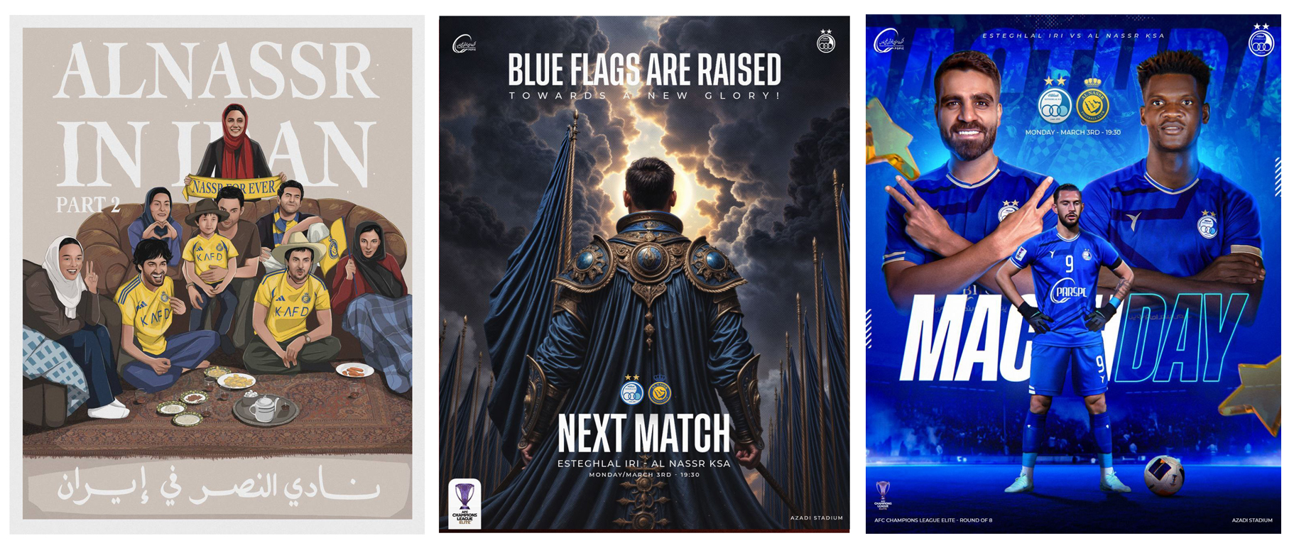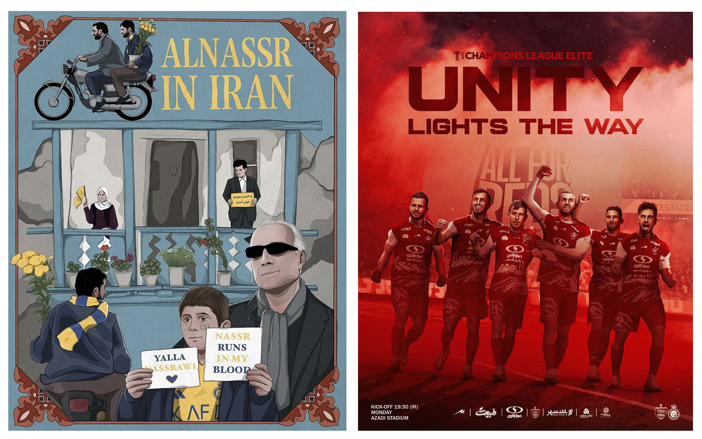 پوستر طراحی شده توسط باشگاه پرسپولیس (سمت راست) در کنار پوستر طراحی شده توسط باشگاه النصرِ عربستان (سمت چپ)