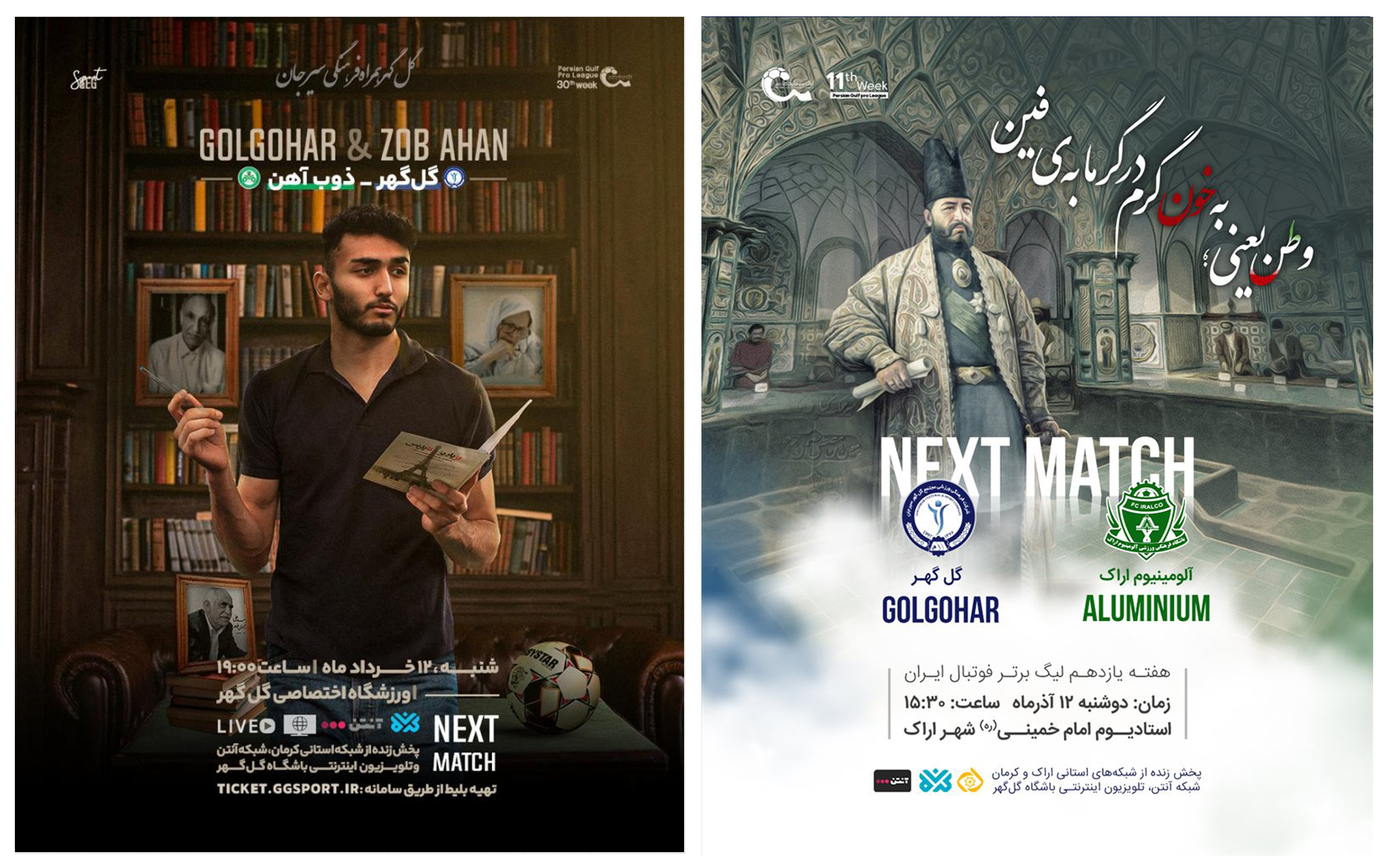 پوستر بازی تیم گلگهر سیرجان با تیمهای آلومینیوم اراک (سمت راست) و ذوب آهن اصفهان (سمت چپ)