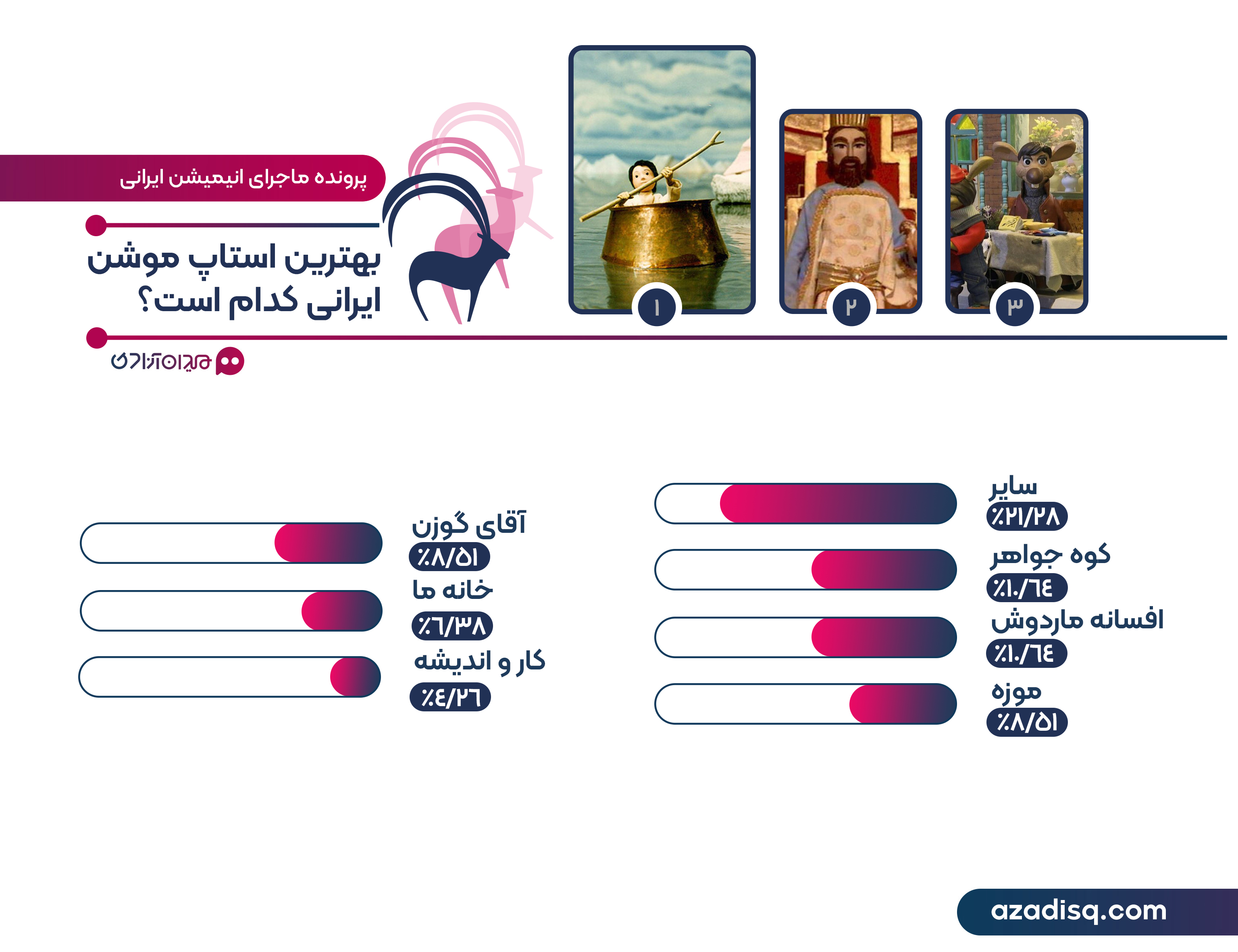 حدود 60 منتقد و متخصص در این نظرسنجی شرکت کردهاند. درصد پاسخهای هر سوال بررسی شده و بهترینهای انیمیشن ایرانی طبق نتایج این نظرسنجی را در ادامه، در 7 صفحه منتشرخواهیم کرد. در این صفحه از پرونده، نتایج بهترین استاپ موشن ایرانی از نگاه منتقدان و متخصصان را خواهید خواند.