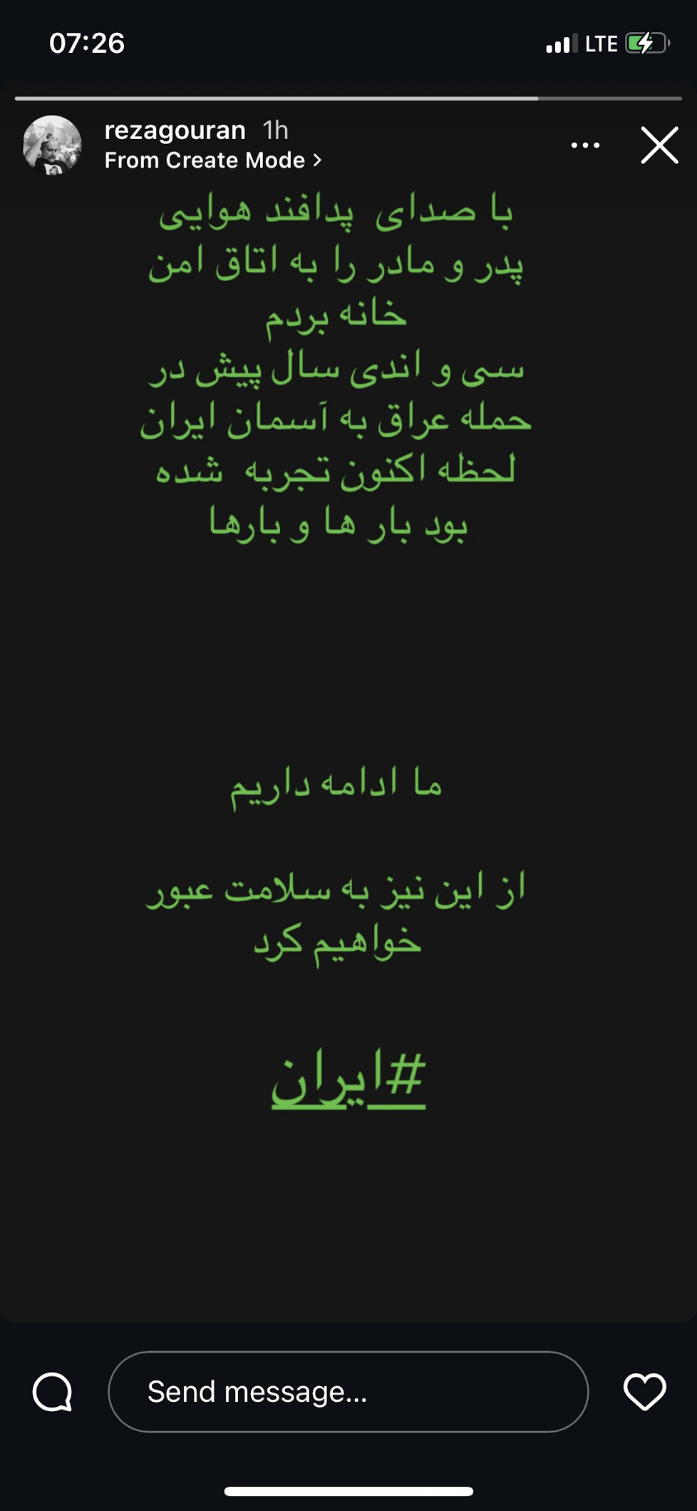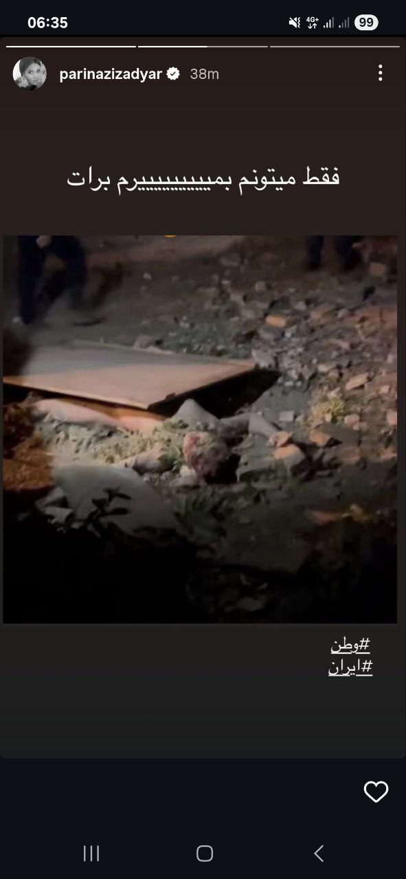 ناراحتم که تهران نیستم و احساس بیغیرتی میکنم. تهران در خطر است و من باید تهران میبودم. این چیزی است ما از زمان جنگ یاد گرفتیم، در زمان موشکباران هم هیچ وقت از تهران خارج نشدم.