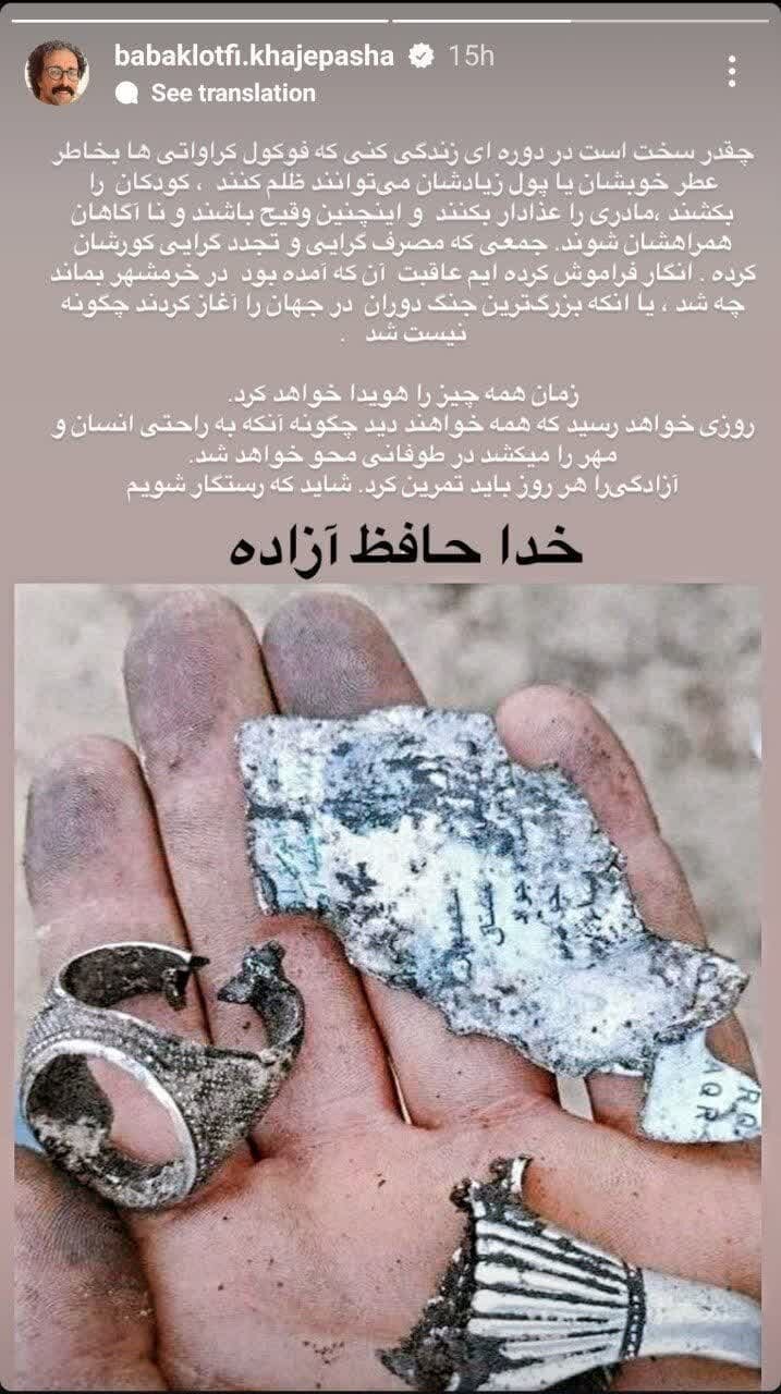 بابک خواجه پاشا، کارگران فیلم «در آغوش درخت» که نمایندهی ایران در اسکار سال جاری خواهد بود نیز در صفحهی اینستاگرامش با انتشار عکسی از بقایای انگشتر از آوار بیرون کشیده شدهی سیدحسن نصرالله، نوشت:
