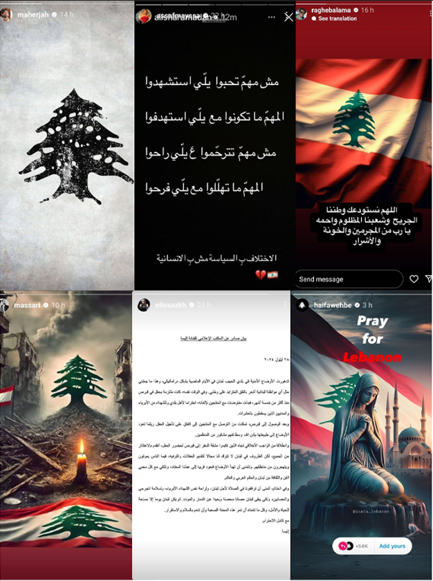 از دیگر واکنشها به این جنایت میتوان به واکنش هنرمندان لبنان اشاره کرد که در میان آنان چهرههای موسیقی و سینمای لبنان دیده میشود. هنرمندانی چون میساء عسّاف، الیسا، ماهر جا، راغب علامه، هیفاء وهبی و ساري عبّود (مساری) که با انتشار تصاویری در صفحه شخصی اینستاگرامشان به این جنایت و بالاگرفتن جنگ در لبنان واکنش نشان دادند.