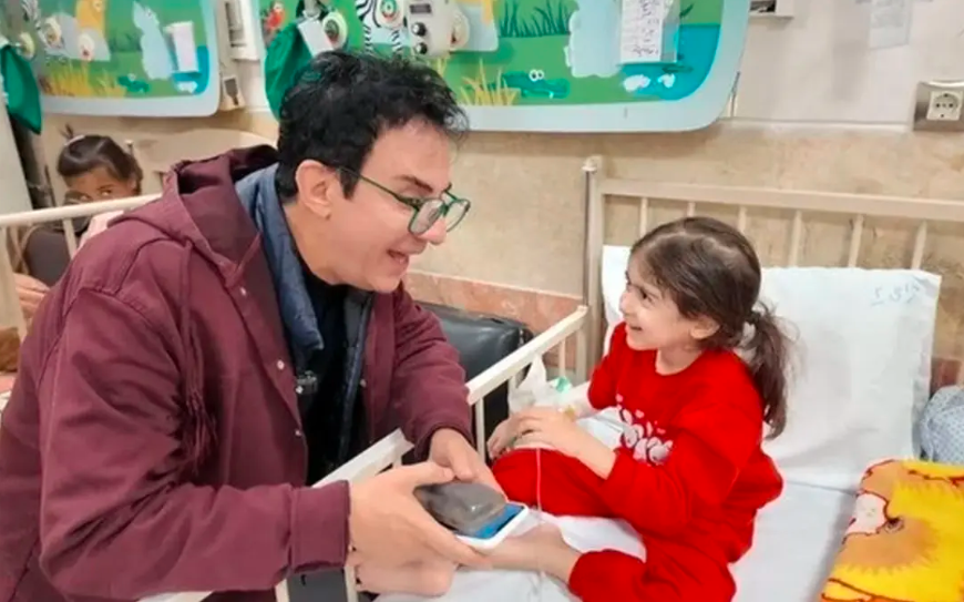 داریوش فرضیایی (عموپورنگ) نیز به دیدار کودکان مجروح و آسیب دیده در جنگ رفت و با آنان به گفتوگو پرداخت.